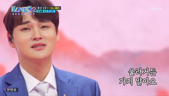 박서진은 지난 2일 방송된 '미스터트롯2'에서 안성훈과 본선 2차 1:1 데스매치를 펼쳤다. 박서진은 안성훈에게 13:2로 패배하며 경연을 마무리하게 됐다.