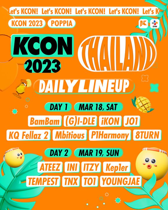 CJ ENM은 오는 3월 18일과 19일 양일간 태국 방콕에서 열리는 'KCON 2023 THAILAND'(이하 '케이콘 2023 태국')에 에이티즈(ATEEZ), 뱀뱀(BamBam), (여자)아이들((G)I-DLE), 아이콘(iKON), INI, 있지(ITZY), JO1, 케플러(Kep1er), 케이큐 펠라즈 2(KQ Fellaz 2), 엠비셔스(Mbitious), 피원하모니(P1Harmony), 템페스트(TEMPEST), TNX, TO1, 영재(GOT7), 에잇턴(8TURN)이 출연한다고 밝혔다.