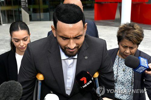 재판장 나서는 닉 키리오스(캔버라 EPA=연합뉴스) 테니스 선수 닉 키리오스가 3일(현지시간) 호주 수도준주 치안법원을 나서고 있다. 2023.2.3 photo@yna.co.kr