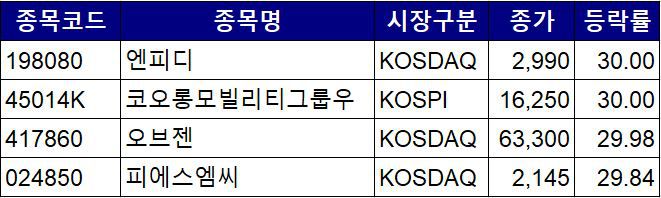 코스닥시장에서는 엔피디가 30.00% 상승한 2990원을 기록했다.