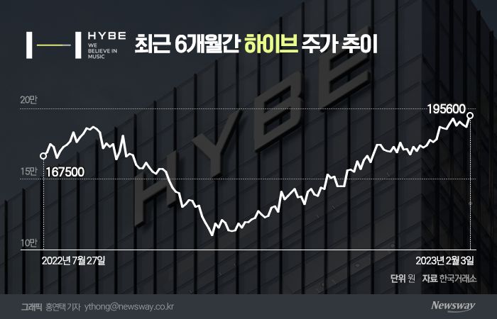 하지만 이때가 확실한 주가 바닥이었다. 멤버 중 맏형인 진이 육군 현역병으로 12월 13일 입대하겠다는 뜻을 밝히자 불확실성이 사라졌고 이때부터 다시 주가는 뛰기 시작했다. 3일 종가 기준으로 19만5600원에 거래를 마쳤는데 이같은 주가 흐름이라면 지난해 6월 이후 8개월 만에 20만원대 회복도 매우 유력해보인다.