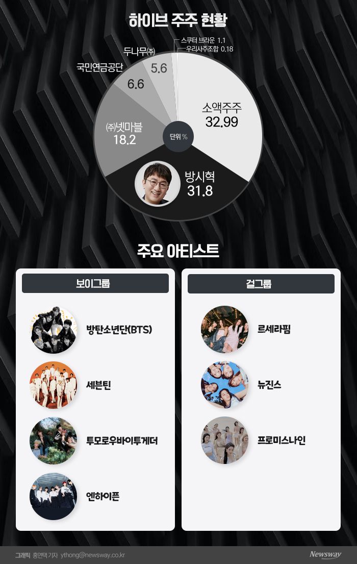 하이브의 지분 구조를 살펴보면 방시혁 의장이 31.8%의 지분을 보유한 최대주주다. 2대 주주는 게임 기업으로 알려진 넷마블로 18.2%의 지분을 보유하고 있다. 국민연금공단과 두나무가 각각 6.6%와 5.6%의 지분을 갖고 있으며 소액주주들이 32.99%를 쥐고 있다.