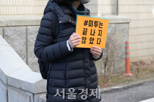 이날 “피해자를 지지한다”라며 법정을 찾은 10여 명 시민들은 ‘미투는 끝나지 않았다’, ‘성폭력을 인정하라’ 등 내용이 적힌 피켓을 들고 오영수를 기다렸다. 첫 공판이 끝나고 오영수가 다시 법원 밖으로 나서자 시민들은 “성폭력을 인정하라”라고 구호를 외쳤다.