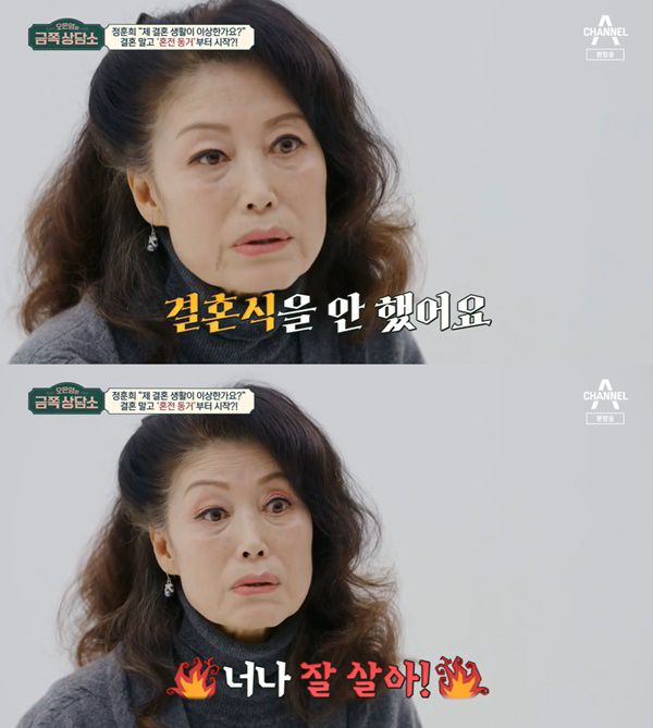 이어 "옛날(1980년대)엔 지금하고 사회적 분위기가 이해하는 것이 달랐다. 연예인 누가 연애하고, 헤어지고, 결혼했다가 이혼하면 여자 팔자는 끝이었다"며 "저는 김태화랑 동거하다가 3년 있다가 큰 애를 낳고, 혼인신고만 하고 결혼식은 안 했었다"고 털어놨다.