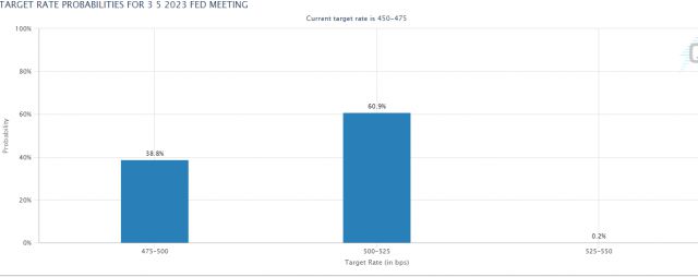 시장도 자신들의 전망을 바꿨습니다. CME 페드워치에 따르면 이날 오후2시7분 현재 3월에 0.25%p의 금리인상을 할 확률이 97.4%에 달하는데요. 5월이 극적으로 변했습니다. 4.75~5.00%로 동결할 것이라는 예측이 37.6%, 5.00~5.25%가 될 가능성이 61.4%인데요. 하루 전만 해도 5.00~5.25%는 30.0%였고 4.75~5.00%가 58.9%로 더 많았습니다. 이게 뒤집어진 건데요. 최소 지난해 12월 연준이 FOMC에서 제시한 최종금리(terminal rate·터미널 레이트)까지는 갈 것이라는 의미죠.