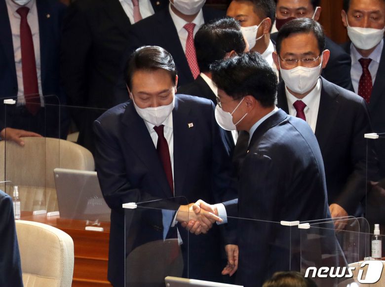 윤석열 대통령이 25일 서울 여의도 국회 본회의장에서 2023년 예산안 시정연설을 마친 후 국민의힘 장제원 의원과 인사하고 있다. (공동취재) 2022.10.25/뉴스1 ⓒ News1 허경 기자