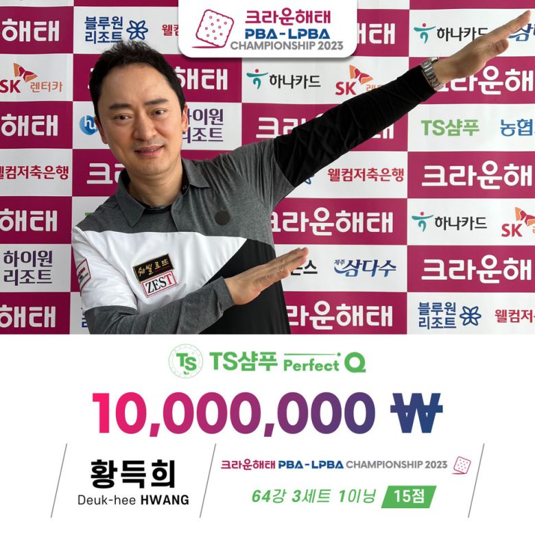 4일 오후 경기도 고양시 빛마루방송센터에서 열린 '크라운해태 PBA-LPBA 챔피언십 2023' PBA 64강전서 황득희는 강민구(블루원리조트)를 상대로 3세트 1이닝서 15점을 한 큐에 달성하는 '퍼펙트큐'에 성공했다.