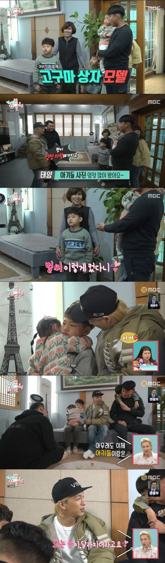 매니저 동생은 "형이 우리 애들을 너무 좋아한다. 내 아들인데 형과 닮았다. 나와는 안 닮았다"라며 너스레를 떨었다. 태양은 "말로만 듣다 실제로 보니 너무 귀엽다"고 말했다.