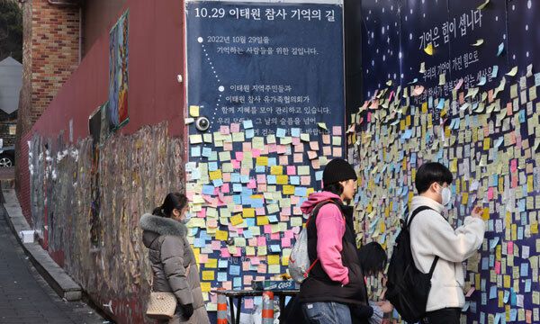 '이태원 참사' 발생 100일째인 5일 오후 사고 현장인 서울 용산구 이태원동 골목에 추모 메세지가 가득하다. 연합뉴스 |