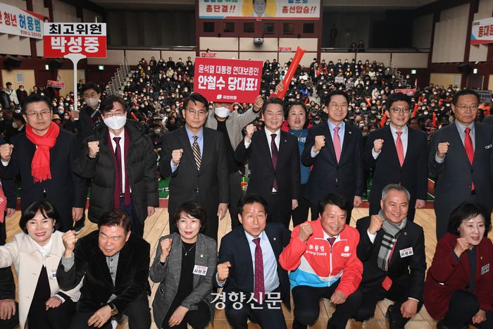 5일 오후 서울 동대문구청 대강당에서 열린 국민의힘 서울 동대문 갑을 당협 합동필승결의대회에서 당대표 후보 및 최고위원 후보들과 참석자들이 포즈를 취하고 있다. 권도현 기자 |