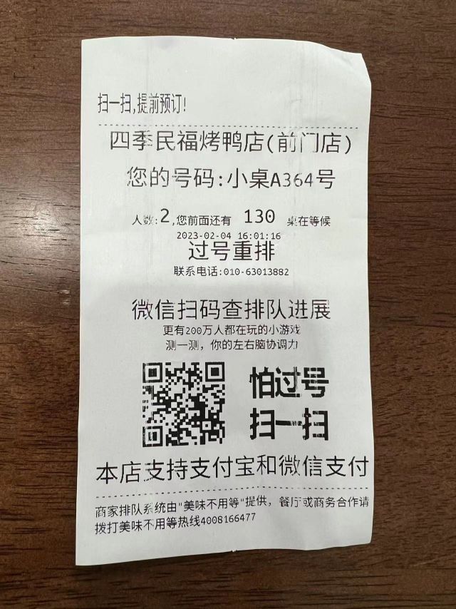 유명 식당들은 대기 손님들로 인해 입구부터 아수라장이었다. 이날 오후 4시께 첸먼다지에의 유명 오리구이 식당인 스지민푸에서 2인용 테이블 기준 대기 번호표를 보니 130팀이 자리를 기다리고 있다는 표시가 찍혀 있었다. 일부 손님들은 대기표를 서로 먼저 받겠다고 서로 밀치며 소리를 지르기도 했다.