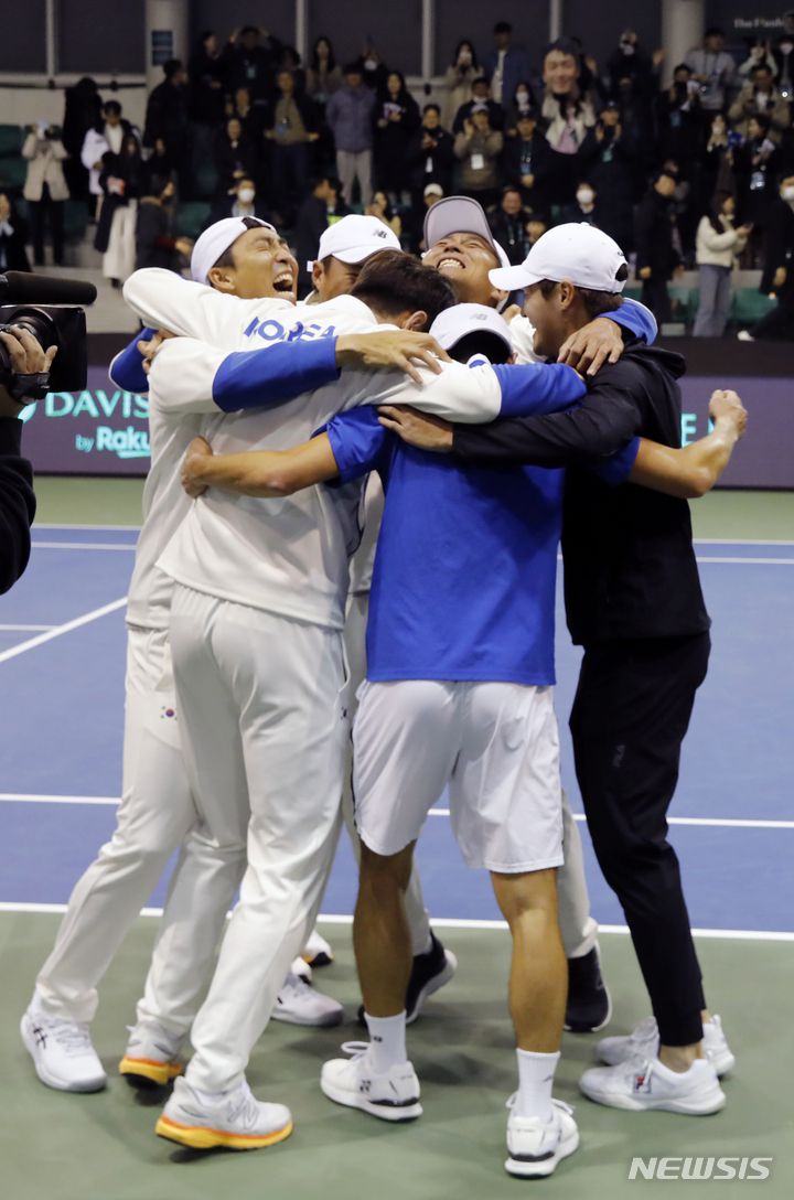 [서울=뉴시스] 김희준 기자 = 한국 남자 테니스 대표팀이 '잠실 대첩'을 일으키며 사상 첫 2년 연속 테니스 국가대항전 세계 16강인 데이비스컵 파이널스 진출을 일굴 수 있었던 중심에는 팀워크와 포기하지 않은 마음이 있었다.