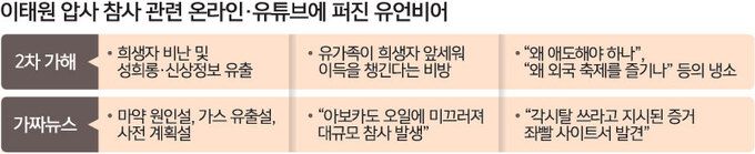 온라인과 유튜브 등을 중심으로 확산한 유언비어, 미확인 음모론 등은 참사 이후 줄곧 불필요한 소음을 키우는 실정이다. 지난달 31일 분향소 앞에서 희생자들을 기리는 159배가 진행된 현장에서 만난 정모(62)씨는 “사람들이 언론을 안 보고 유튜브를 많이 보는데, 이태원 압사 참사 관련해 가짜뉴스를 퍼뜨리는 이들이 너무 많다”고 한탄했다.