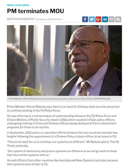 피지는 솔로몬제도와 함께 중국에 우호적인 남태평양 도서 국가의 하나로 꼽히는데, 이 나라가 최근 2011년 중국과 맺은 공안 협력 양해각서 파기를 선언했어요. 작년 12월 총선 승리 후 취임한 시티베니 라부카 신임 총리는 1월26일 피지 타임스 인터뷰에서 “중국 공안 인력이 더는 피지 경찰에서 일할 필요가 없다”고 했습니다.
