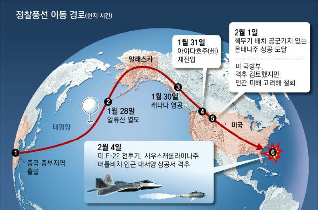 미 국방부 고위 관계자는 4일(현지 시간) 브리핑에서 “정찰풍선은 1월 28일 알류샨열도 북쪽 (알래스카) 지역 방공식별구역(ADIZ)에 진입했고, 캐나다 노스웨스트 준주(準州)를 거쳐 1월 31일 아이다호주 북부 미국 영공을 침범했다”고 밝혔다. 정찰풍선은 이어 몬태나주와 미주리주를 거쳐 4일 사우스캐롤라이나를 통해 대서양 해변을 통과했다. 7일간 미국을 남동 방향으로 횡단한 것이다. 이 관계자는 “중국 정찰풍선은 이전 행정부에서 적어도 세 번, 그리고 바이든 행정부 초기 한 차례 미국 영공을 잠시 통과했지만 이렇게 장시간 상공을 침입한 적은 없었다”고 했다.