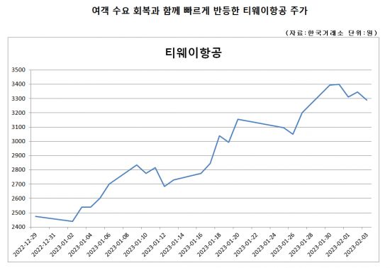 [아시아경제 박형수 기자] 올 들어 티웨이항공 주가 상승이 이어지고 있다. 코로나19 대유행으로 급감했던 여객 수요가 회복 국면에 접어들면서 실적 개선 기대감이 커진 영향이다. 다만 기대감이 선반영되면서 실제 실적을 확인하려는 심리도 커지고 있어, 주가가 더 오르기까지는 시간이 필요하다는 분석도 나온다.