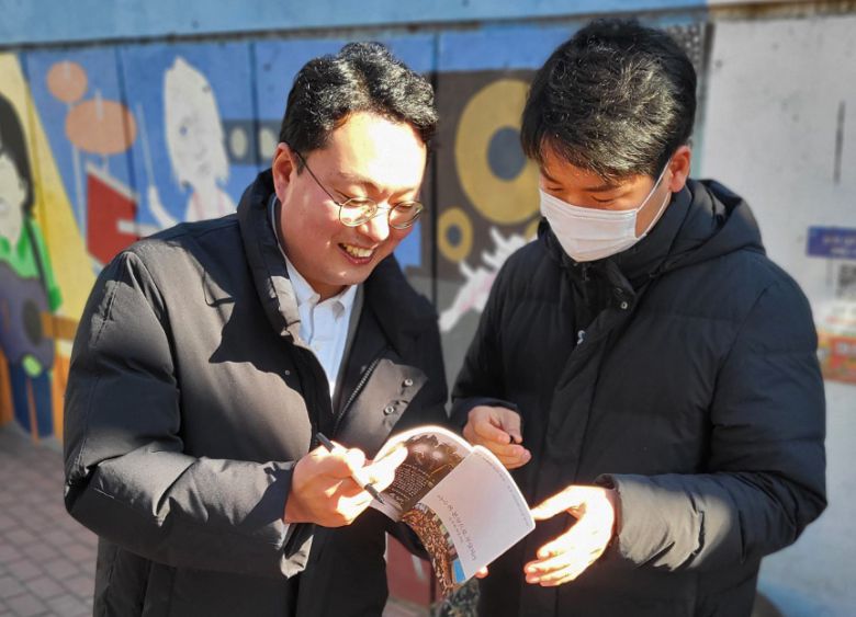 천하람 국민의힘 당 대표 후보(왼쪽)가 5일 대구 중구 김광석 거리를 방문하고 있다. [연합]