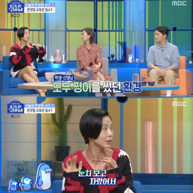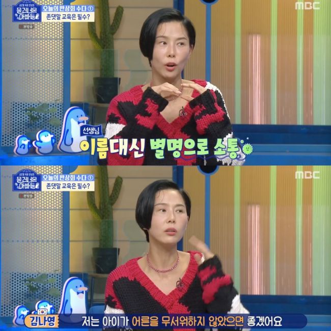특히 반말에 동참했던 김나영은 “저희가 다녔던 어린이집은 다들 평어를 썼다. 교사랑 아이랑. 교사를 선생님이라고 부르지 않고, 별명이 있어가지고 별명으로 부르고 되게 수평적으로 그렇게 지냈다”라고 밝혀 놀라움을 안겼다. 이어 그는 “저는 아이가 어른을 무서워하지 않았으면 좋겠다. 제가 어릴 때 어른이 되게 어려웠었다. 그래서 되게 해야 될 말을 못하고 되게 눈치보고 자랐어서 아이가 어른을 어려워하지 않았으면 좋겠어서 반말을 많이 쓴다”라며 반말 사용을 권장한다고 전했다.
