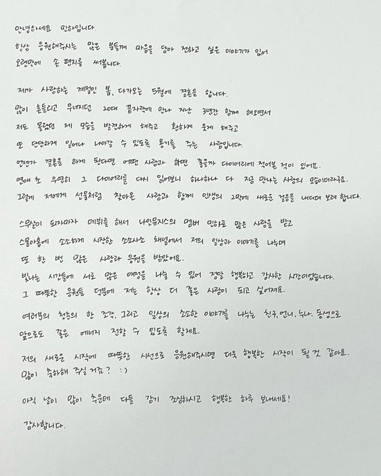 이어 "스무살이 되자마자 데뷔해서 나인뮤지스 멤버 민하로 많은 사랑 받고 스물 아홉에 소소하게 시작한 사소사소에서 저의 일상을 나누며 또 한 번 많은 사랑과 응원을 받았다. 빛나는 시간들에 서로 많은 애정을 나눌 수 있어 정말 행복하고 감사한 시간"이라 감사한 마음을 전했다.