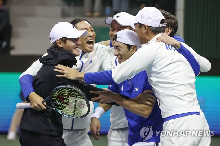 '해냈다!' 5일 서울 송파구 올림픽공원 실내테니스 경기장에서 열린 2023 데이비스컵 최종 본선 진출전(4단 1복식) 4단식 한국 홍성찬과 벨기에 지주 베리스의 경기에서 세트 스코어 2 대 0(6-3 7-6<7-4>)으로 승리한 한국 홍성찬이 권순우 등 선수단과 기뻐하고 있다. 연합뉴스