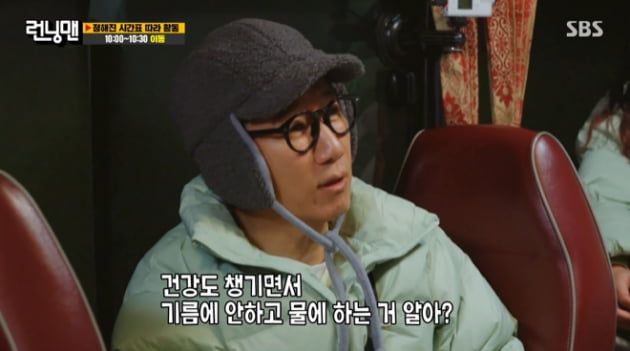 이어 송지효가 계란후라이를 잘 하는지에 대한 이야기가 나왔고, 하하는 "계란후라이는 기름을 많이 넣으면 무조건 맛있다. 백종원 선생님이 그렇게 한다"고 하자 지석진은 "기름 많으면 건강에 안좋다. 물에 그냥 후라이 하는거 아느냐"고 했다. 이를 들은 김종국은 "형은 건강을 생각할거면 담배를 끊는게 낫지 않나요?"라고 반박했고, 이를 들은 지석진은 "우리 아내가 무슨 말만하면 담배나 끊으라고 결론을 낸다. 할 말이 없다"고 했다.