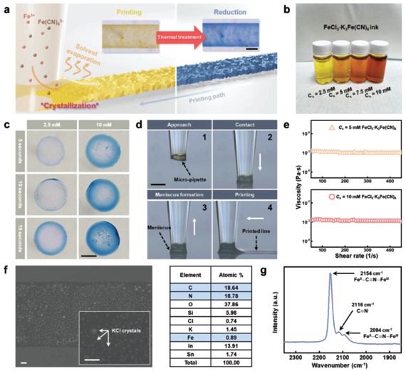 a: 프러시안 블루잉크의 메니스커스 형성 및 결정화되는 과정의 모식도 b: 농도에 따른 프러시안 블루 잉크의 모습 c: 잉크 농도와 증착 시간과의 관계 d: 피펫 노즐에서 메니스커스를 형성하는 과정 확대 사진 e: 프러시안 블루 잉크의 점성 특성 f: 프린트된 프러시안 블루 패턴의 표면 분석 및 원소 함유 분석 결과 g: 라만 스펙트럼 기법을 이용한 프러시안 블루의 형성 여부 분석 /사진=유니스트 제공