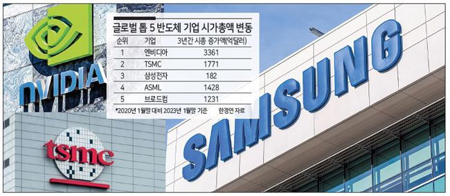 3년 전과 비교할 때 엔비디아와 TSMC는 2~3배 가량 몸값이 높아진 반면, 삼성전자는 3년 전 수준에 머물고 있다.
