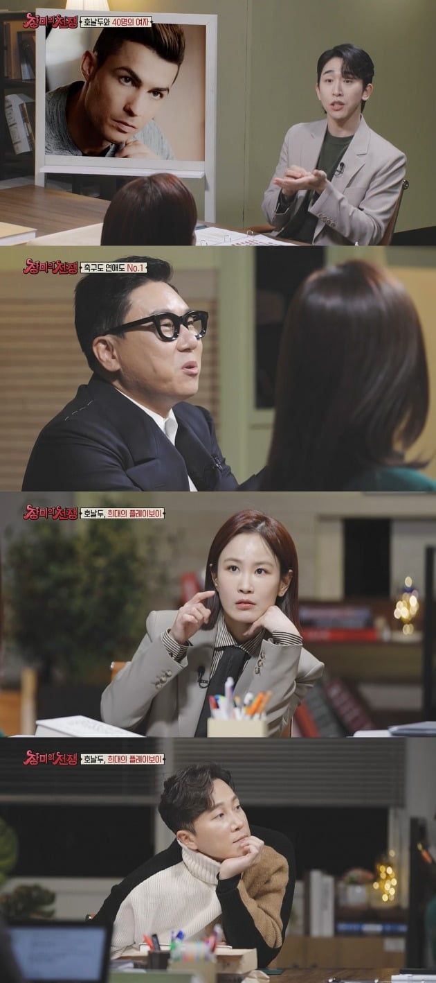 그런가 하면 사연을 소개하던 이승국은 “40명 여자의 공통점이 상상을 초월할 정도로 하나도 없었다”고 밝혀 반전을 안긴다. 나이, 직업, 국적, 하다못해 머리색과 눈동자까지 공통분모가 하나도 없다는 호날두의 여자들. 이에 이상민은 “(호날두가) 취향이 없는 거다. 그냥 여자면 되는 것”이라며 팩트 폭행 멘트를 날린다. 양재웅은 “콜럼버스 같은 남자”라며 찰떡같은 비유를 덧붙이기도.