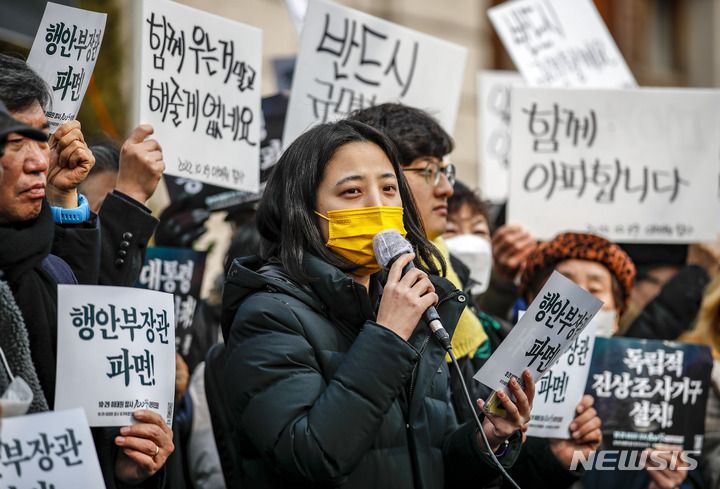 [서울=뉴시스] 정병혁 기자 = 류호정 정의당 의원이 6일 오후 서울 중구 서울광장에 설치된 분향소 앞에서 열린 서울시의 분향소 행정대집행 관련 규탄 기자회견에서 발언하고 있다. 2023.02.06. jhope@newsis.com