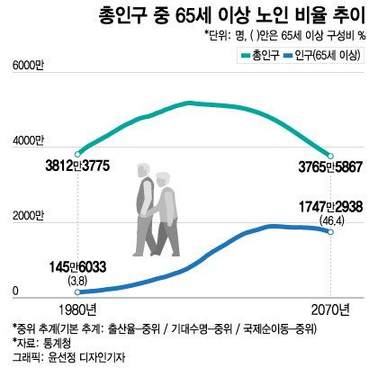 다만 노인 연령과 정년을 조정하더라도 점진적으로 추진해야 한다는 지적이다. 이태석 KDI(한국개발연구원) 연구위원은 "노인연령을 현재와 같이 유지할 경우 2054년 이후 한국의 노인인구 부양부담이 OECD 국가 중 가장 높은 수준을 보일 것으로 전망된다"면서도 "노인 연령을 3년 또는 5년에 한번 점진적으로 조정해 (생일) 몇달 차이로 큰 손해를 보는 일은 없어야 한다"고 말했다.