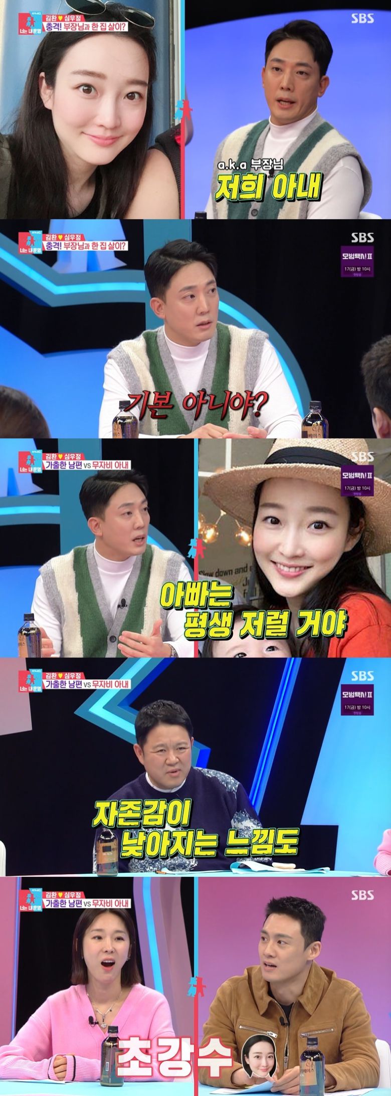프리 선언 6년차라는 김환은 아내를 부장님처럼 모신다고 해 궁금증을 유발했다. 그는 "일단 명령조가 많다. 문자 온 걸 어떤 후배가 봤는데 '이건 상사와의 대화 내용인데?' 하더라"라며 "아내가 저한테 '기본 아니야? 기본이 없네' 이런 말투를 쓴다. 명령조라 좀 세다"라고 털어놨다.