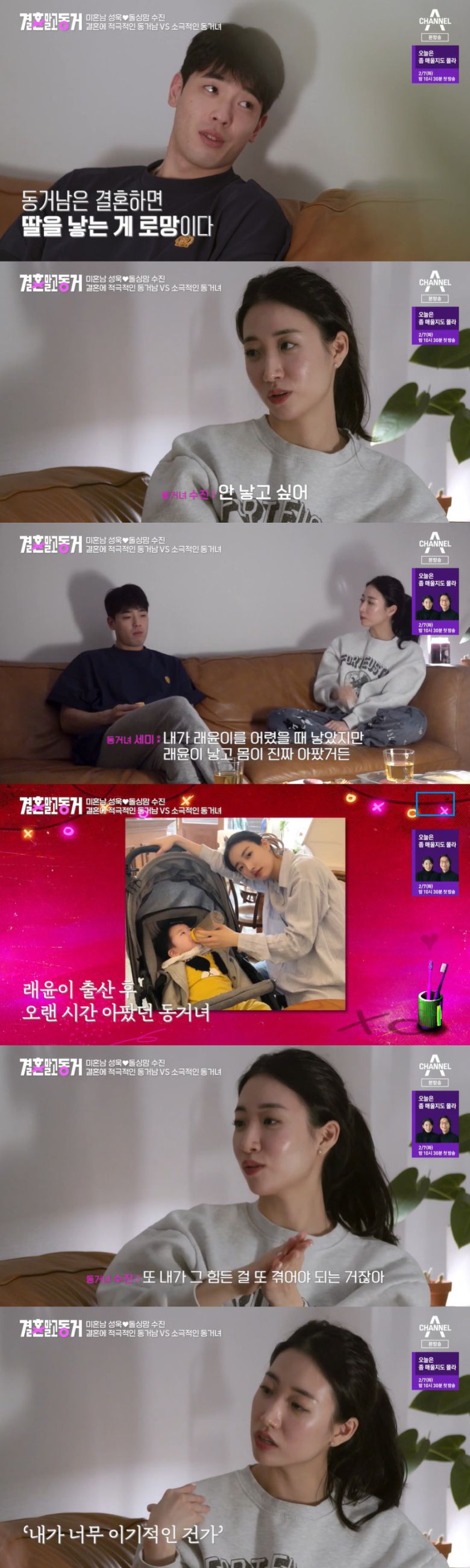 6일 방송된 채널A '결혼 말고 동거'에서는 '3인 동거'로 행복이 넘치는 배수진, 배성욱 커플이 가진 큰 현실의 벽이 공개됐다.