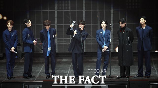 방탄소년단이 '제65회 그래미 어워드' 후보에 올랐으나 아쉽게 수상하지 못 했다. 사진은 지난해 10월 열린 '2022 더팩트 뮤직 어워즈'에서 수상하는 모습. /임영무 기자