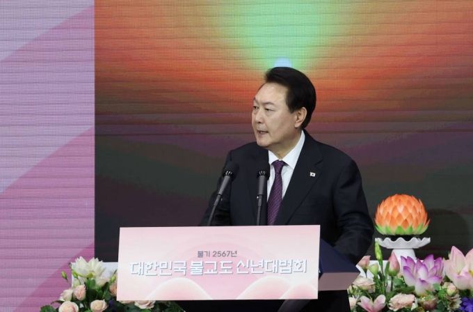 [서울=뉴시스] 홍효식 기자 = 윤석열 대통령이 6일 서울 강남구 코엑스에서 열린 불기 2567년 대한민국 불교도 신년대법회에서 축사를 하고 있다. (대통령실통신사진기자단) 2023.02.06. |