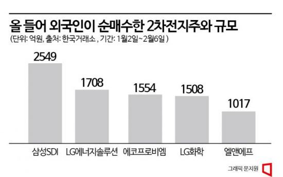외국인과 기관 투자가들의 '쌍끌이' 매수 역시 국내 2차전지 관련주들의 주가를 견인했다. 올해 1월2일부터 2월6일까지 외국인과 기관이 순매수한 상위 종목 중 2차전지 관련주들이 다수 포함됐다. 외국인은 삼성SDI(2549억원)·LG에너지솔루션(1708억원)·에코프로비엠(1554억원)·LG화학(1508억원)·엘앤에프(1017억원) 등을 대거 사들였다. 같은 기간 기관 투자가들은 LG에너지솔루션(1443억원)·엘앤에프(739억원)·에코프로비엠(540억원)·포스코케미칼(377억원) 등을 순매수했다.