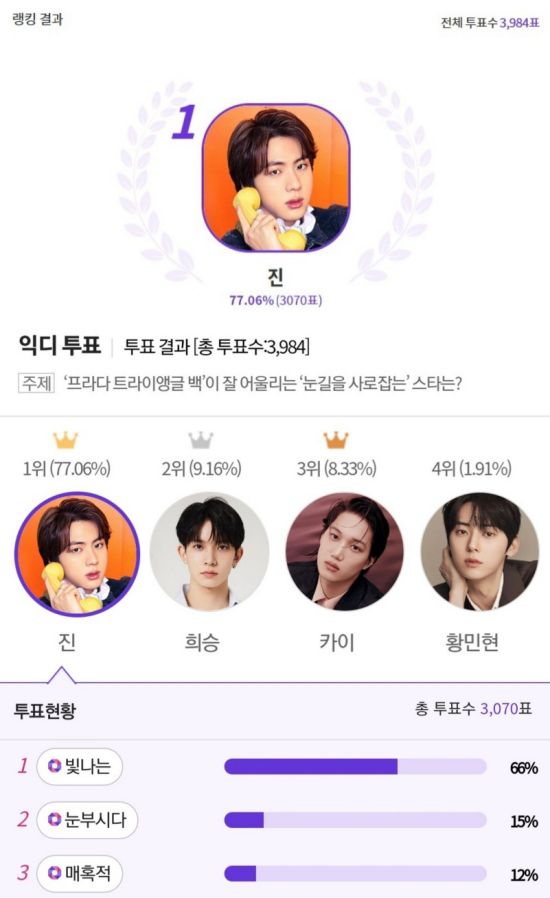 방탄소년단 진은 그중 총 투표수 3,984표중 3,070표(77.06%)를 얻으며 1위를 기록했다.