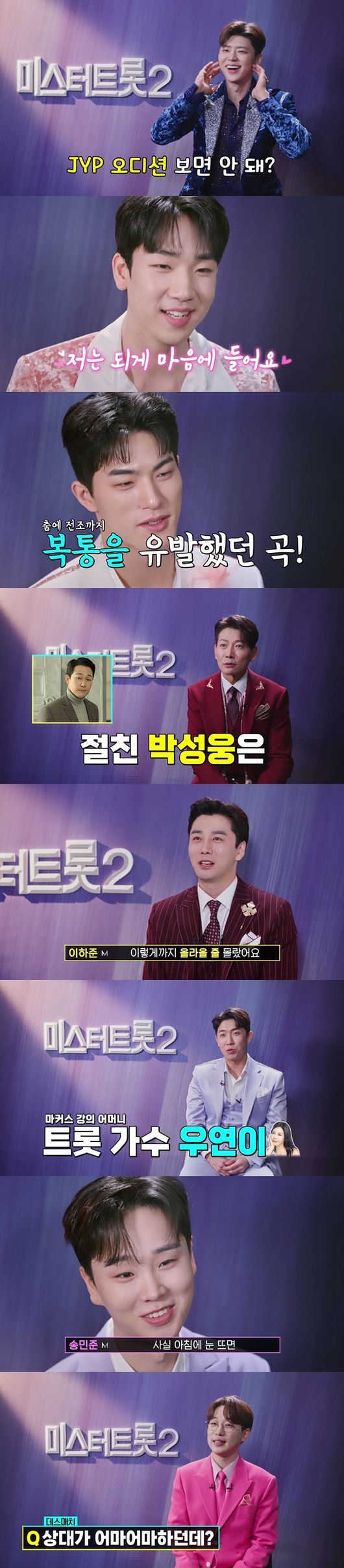 ‘미스터트롯2’에서는 초반부터 올하트 퍼레이드를 벌이고 있는 대학부의 기세가 무섭다. 마스터 예심 ‘진’이자 ‘활어 보이스’ 박지현은 “중학교 때 JYP 오디션을 보고 싶었다”고 10대 시절 이야기를 밝힌다. JYP가 트롯에 빼앗긴(?) 인재 박지현의 놀라운 한풀이 댄스 실력은 이번 스페셜에서 공개된다.