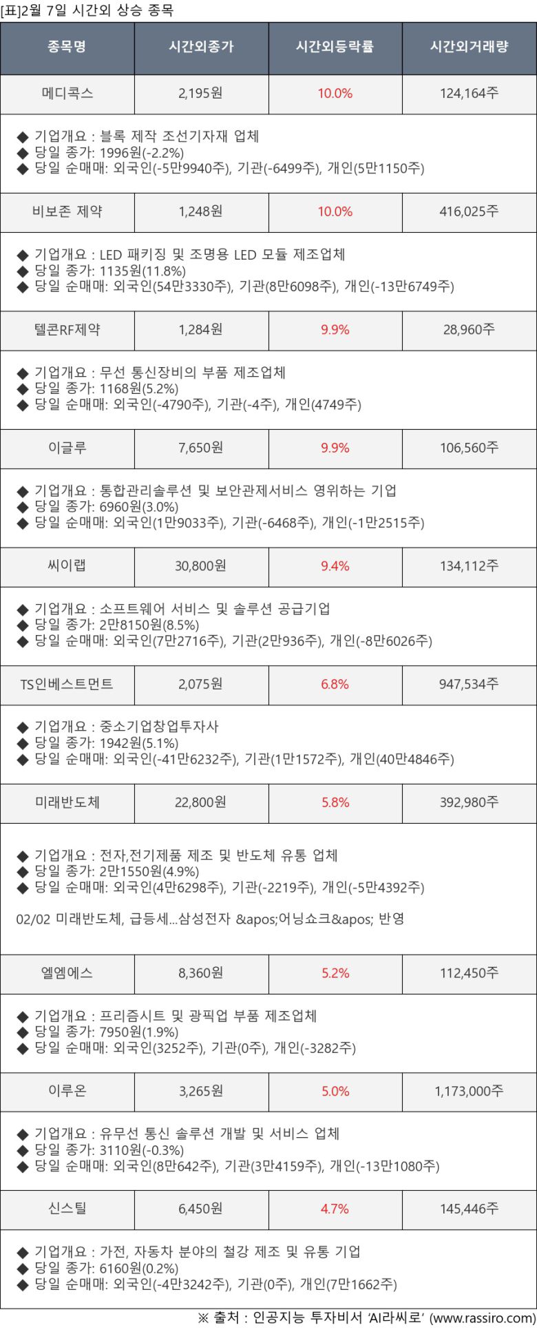 [표]2월 7일 시간외 상승 종목 및 최근 동향