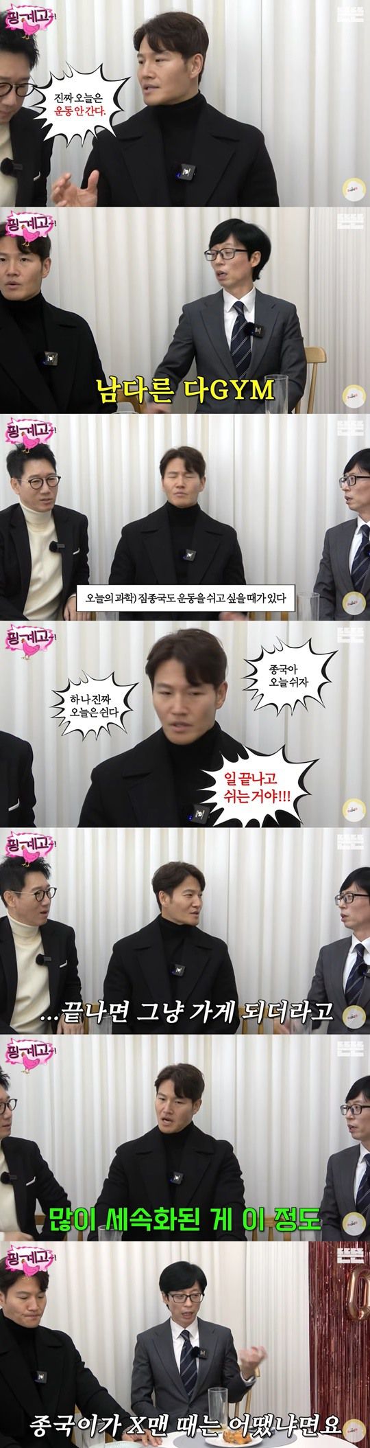 더해 김종국은 몸 관리에 대해 아침에 일어날 때 운동을 쉬겠다고 다짐을 해도 결국 스케줄이 끝나면 운동을 가게 된다고 했다. 유재석은 "그래도 얘가 지금은 많이 세속화됐다"고 했다. 김종국은 "오늘도 라면을 먹고 왔다. 많이 열렸다"면서 했다. 유재석은 "종국이가 예전에 X맨 같이 할 때는 단백질 이외에는 섭취를 안 했다"고 덧붙였다.