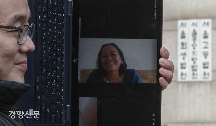 웃음 찾은 피해자 베트남전쟁 당시 한국군에 의한 민간인 학살 피해 생존자인 응우옌 티 탄이 7일 서울 서초구 서울중앙지법에서 열린 국가배상소송 1심에서 일부 승소한 뒤 화상 연결을 통해 소감을 밝히고 있다. 성동훈 기자 zenism@kyunghyang.com