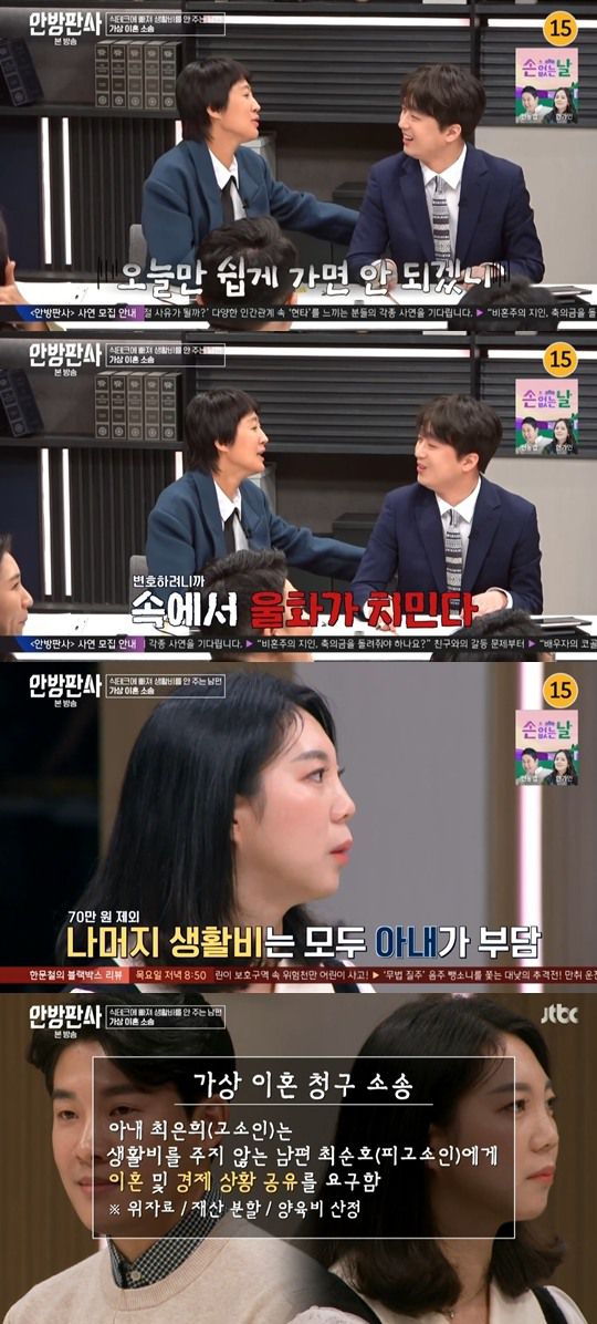 7일 방송된 JTBC 법정 예능 토크쇼 ‘안방판사’에서는 수입도 공개하지 않은 채 상활비도 제대로 안 주고, '식테크'에만 몰두하는 남편 의뢰인이 등장했다. 아내는 이런 남편과 이혼을 원하며, 경제 상황을 공유할 것도 요청하고 있었다.