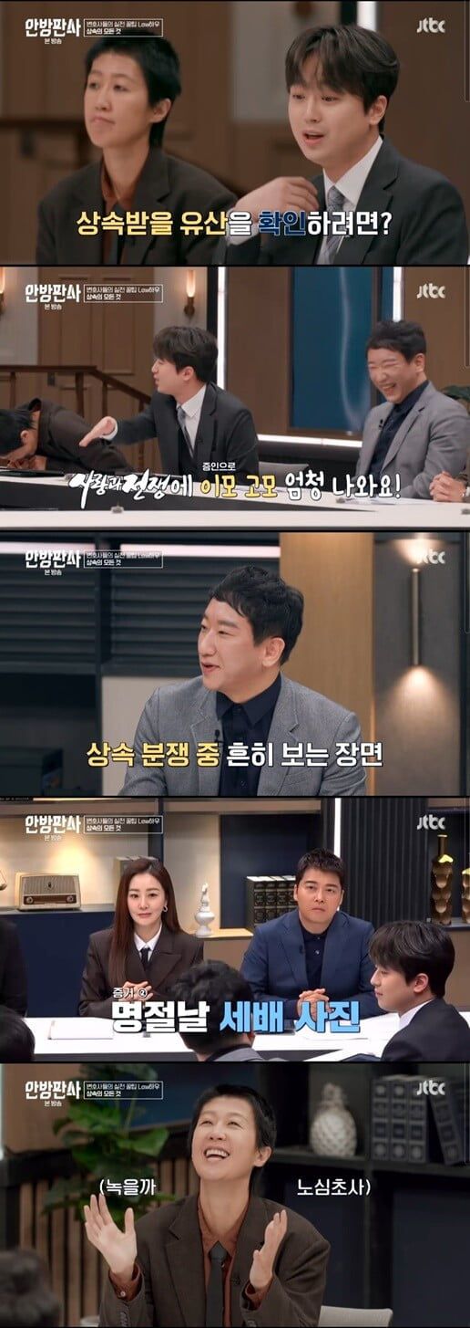 7일 밤 방송된 JTBC 예능 ‘안방판사’에서는 부모님의 상속 재산을 두고 꿀팁을 전수받는 전현무, 홍진경, 이찬원, 오나라의 모습이 담겼다.