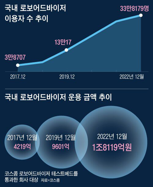 인공지능(AI)을 활용한 로보어드바이저(Robo Advisor) 시장은 갈수록 커지고 있다. 한국거래소 전산운용업체인 코스콤 집계에 따르면, 작년 12월 국내 이용자 수는 33만8179명으로 1년 전보다 12% 증가했다. 5년 전인 2017년과 비교하면 10배 가까이 급증했다. 로보어드바이저가 운용하는 금액도 2017년 4219억원에서 지난해 1조8119억원으로 4.2배 늘었다.