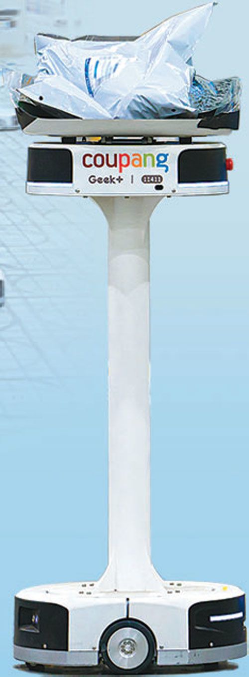 쿠팡 대구 풀필먼트센터(FC)에서 작업자들은 집품을 위해 한 발자국도 움직일 필요가 없었다. 바둑판처럼 구획이 나뉜 바닥의 수많은 QR코드를 따라 미끄러지듯이 움직이는 무인 운반 로봇 AGV(Automated Guided Vehicles)가 주문 제품이 보관된 선반을 통째로 작업 구역 앞으로 정확하게 옮겨줬기 때문이다.