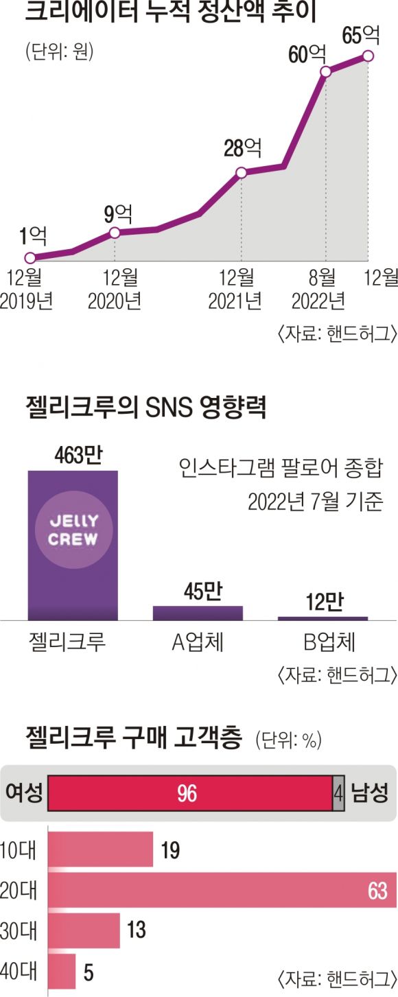 그래도 배고픈 크리에이터가 없게 하겠다는 것이 젤리크루의 가장 큰 장점이다. 크리에이터들에게 돌려준 누적 정산금은 론칭 3년 만에 65억원을 넘기면서 크리에이터 이코노미를 구축했다. 크리에이터 이코노미는 MZ세대를 중심으로 자신이 만든 콘텐츠로 직접 돈을 버는 경제 구조를 말한다. 젤리크루 상위 3명의 평균 누적 정산액은 4억원이 넘는다.