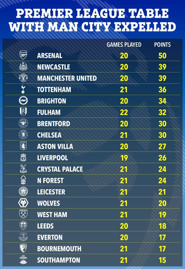 영국 더선은 맨체스터시티엔 최악의 시나리오인 리그 퇴출을 가정한 현재 순위표를 7일(한국시간) 공개했다.