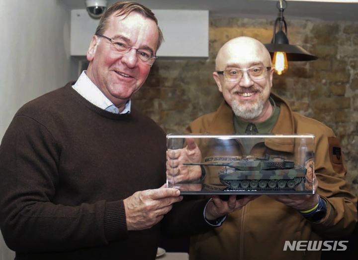 [키이우=AP/뉴시스] 7일(현지시간) 우크라이나 국방부가 공개한 사진으로, 우크라이나 수도 키이우에서 올렉시 레스니코프 우크라이나 국방장관(오른쪽)과 보리스 피스토리우스 신임 독일 국방장관으로부터 독일 주력전차 레오파드2 탱크 모형을 들고 있다. 2023.02.08 |