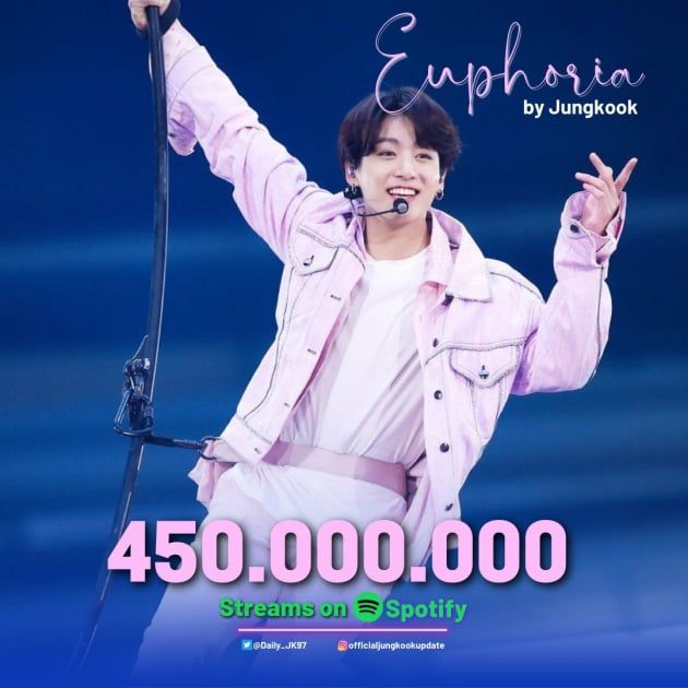 세계 최대 음원 스트리밍 플랫폼 스포티파이(Spotify)에서 정국의 솔로곡 'Euphoria'가 4억 5000만 스트리밍을 넘어섰다.