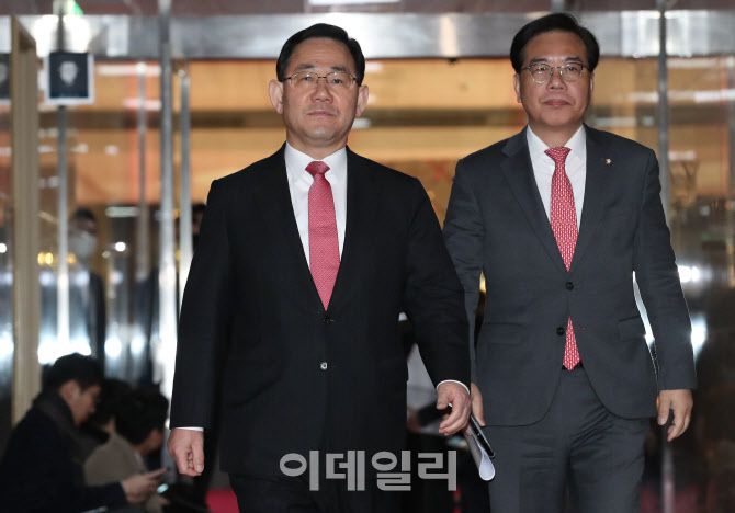 [이데일리 노진환 기자] 주호영(왼쪽) 국민의힘 원내대표와 송언석 원내수석부대표가 8일 오전 서울 여의도 국회에서 김진표 국회의장과 면담을 위해 의장실로 향하고 있다.