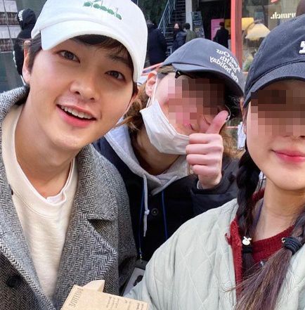 공개된 사진 속에는 연극 '독'의 마지막 공연 현장을 찾은 송중기의 모습이 담겨있다. '독'에 출연하는 스태프와 함께 환한 미소를 짓고 있어 눈길을 끈다.